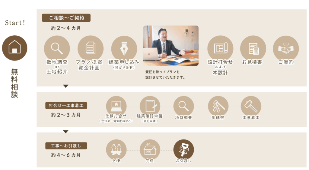 その後、以下の図のように土地探しや敷地調査から家づくりがスタートしていきます。